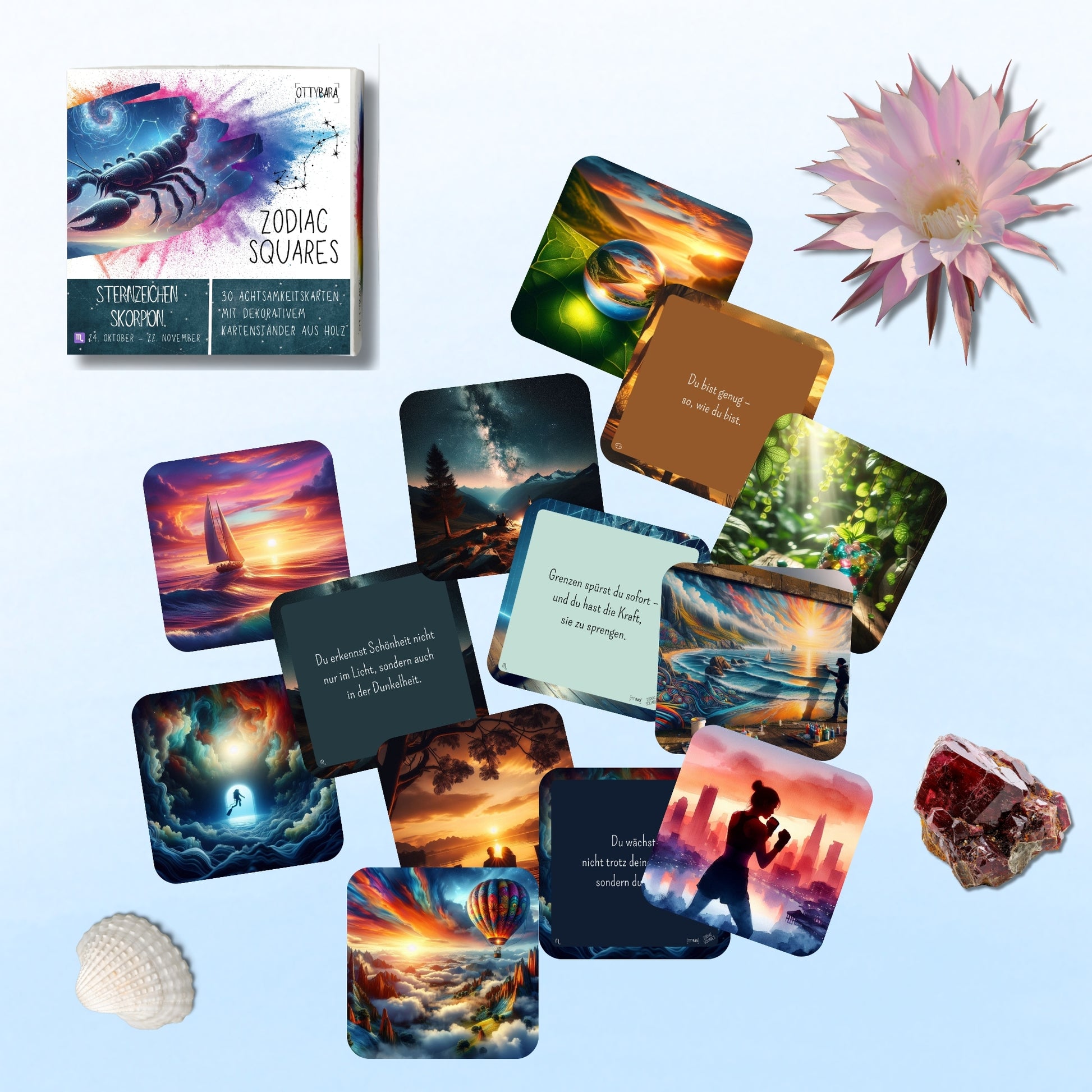 Zodiac Squares – Sternzeichen Skorpion – 30 inspirierende Achtsamkeitskarten mit Kartenständer aus Holz | Hochwertige doppelseitige Designs für Achtsamkeit, Motivation & Selbstreflexion